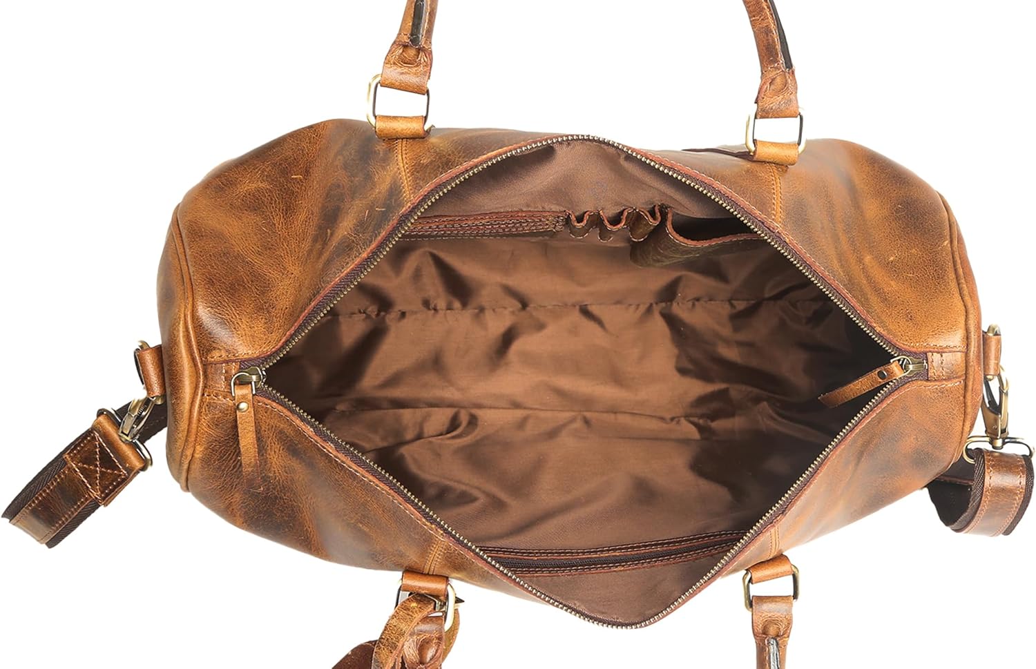 - FEATURES: - Our handcrafted quality hardware is riveted to thick top grain leather and finished with solid stitching. One main compartment with wall separators for books and iPads.1 inner zipper pocket, pen and card holder in it.A single zipper bag that is great for every occasion on the weekend. It comes with an adjustable and removable matching shoulder strap to go away with, or you can just pick and go with the twin handles available.